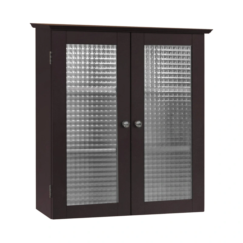 Espresso Bathroom Wall Cabinet with Glass Doors Elegant and functional, the Chesterfield Bathroom Wall Cabinet by Teamson Home offers sleek storage options with its espresso finish and waffle-textured glass doors. Built from sustainable engineered wood, it
