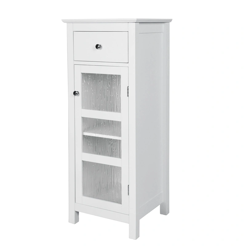 Connor 36" White Linen Cabinet Enhance your space with the Teamson Home Connor 36" White Linen Cabinet, combining contemporary style with functional storage. This freestanding unit, crafted from durable engineered wood, features a water-textured glass pane