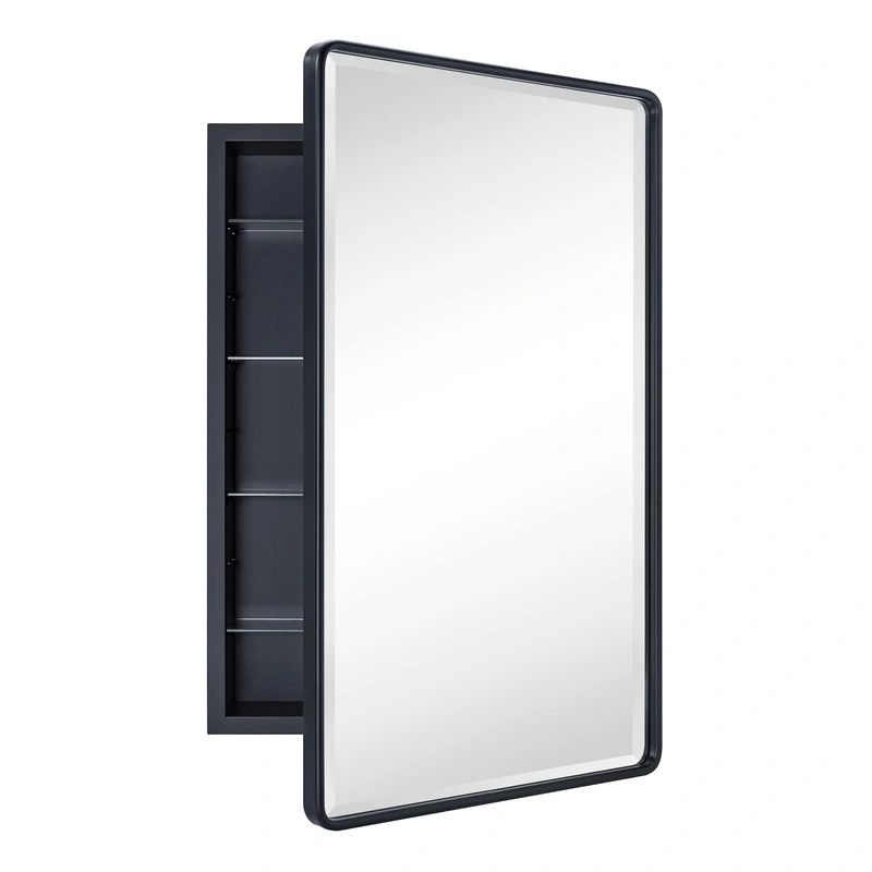 Recessed Mount Matt Black Mirrored Medicine Cabinet Elevate your bathroom style with the TEHOME Recessed Matte Black Medicine Cabinet. This sleek and elegant piece features a premium aluminum door framed with a beveled mirror, offering a touch of luxury an