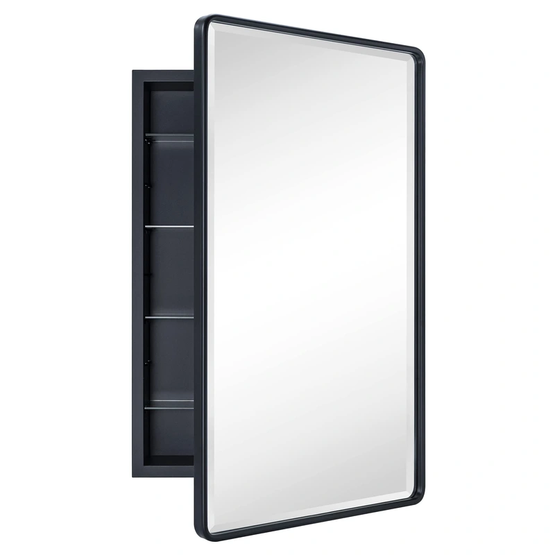 Matte Black Mirrored Medicine Cabinet Elevate your bathroom decor with the TEHOME Mirrored Medicine Cabinet, boasting a chic matte black finish and a beveled mirror for a timeless aesthetic. This recessed mount cabinet provides ample storage with adjustabl