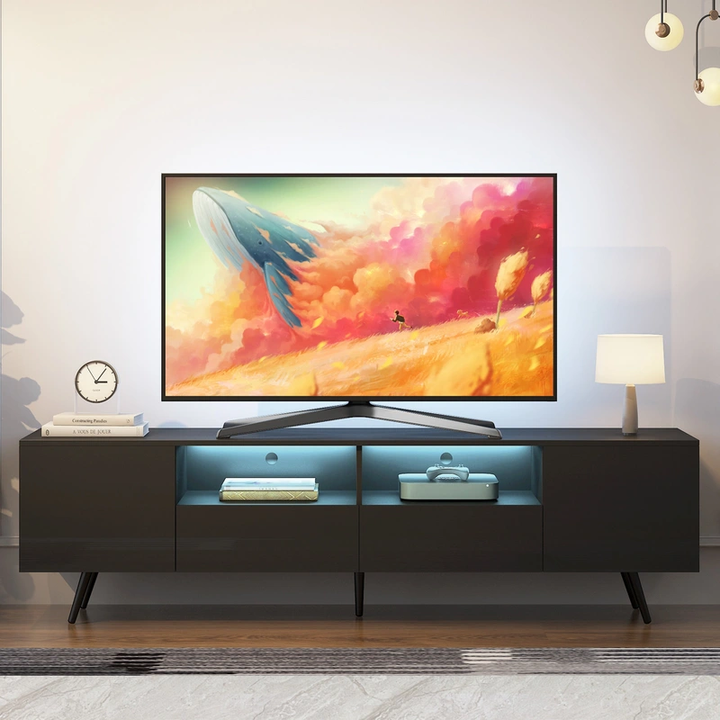 ToolCat Modern Black TV Cabinet with LED Lighting Revamp your space with the ToolCat Modern Black TV Cabinet, equipped to enhance your home entertainment experience with its sleek design and built-in LED lighting. This stylish unit fits TVs up to 65 inches