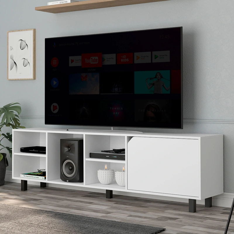 A: This TV cabinet features five open shelves for ample storage of books, decor, and entertainment items.