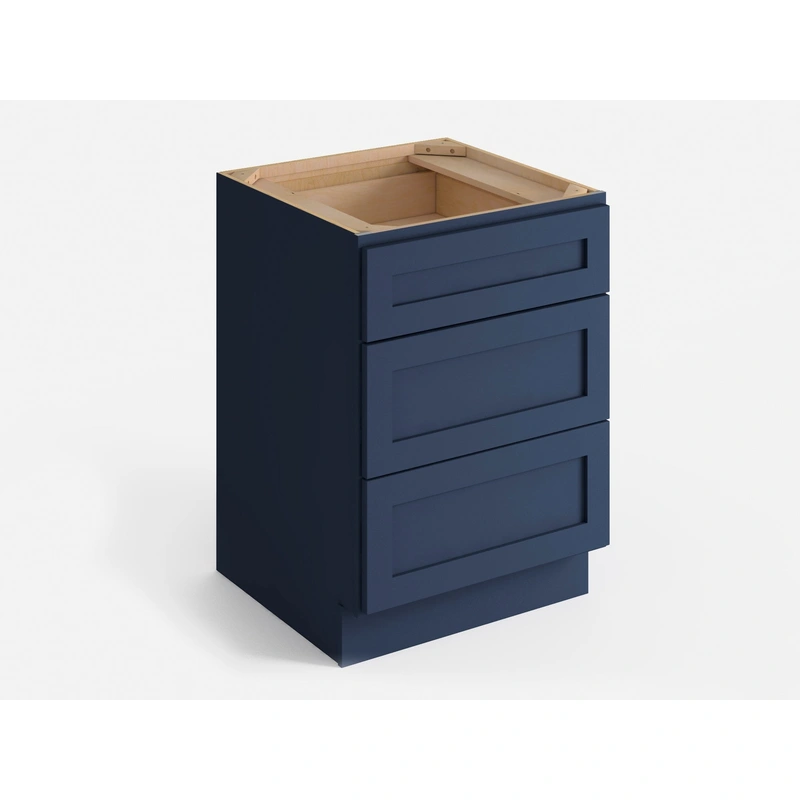 Marine Blue Birch 3-Drawer Base Cabinet Elevate your kitchen with the Valleywood Cabinetry Marine Blue 3-Drawer Base. Featuring robust birch wood and a striking marine blue finish, this flat panel cabinet combines durability and style, perfectly suited for