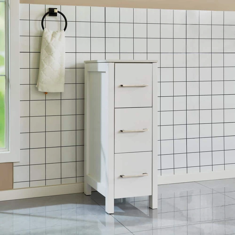 The Vanity Art 12-inch Bath Vanity Side Cabinet is a stylish and functional addition to your bathroom. With a pristine white finish and an engineered marble top, this cabinet offers both elegance and durability while providing ample storage space with its three soft-closing drawers.