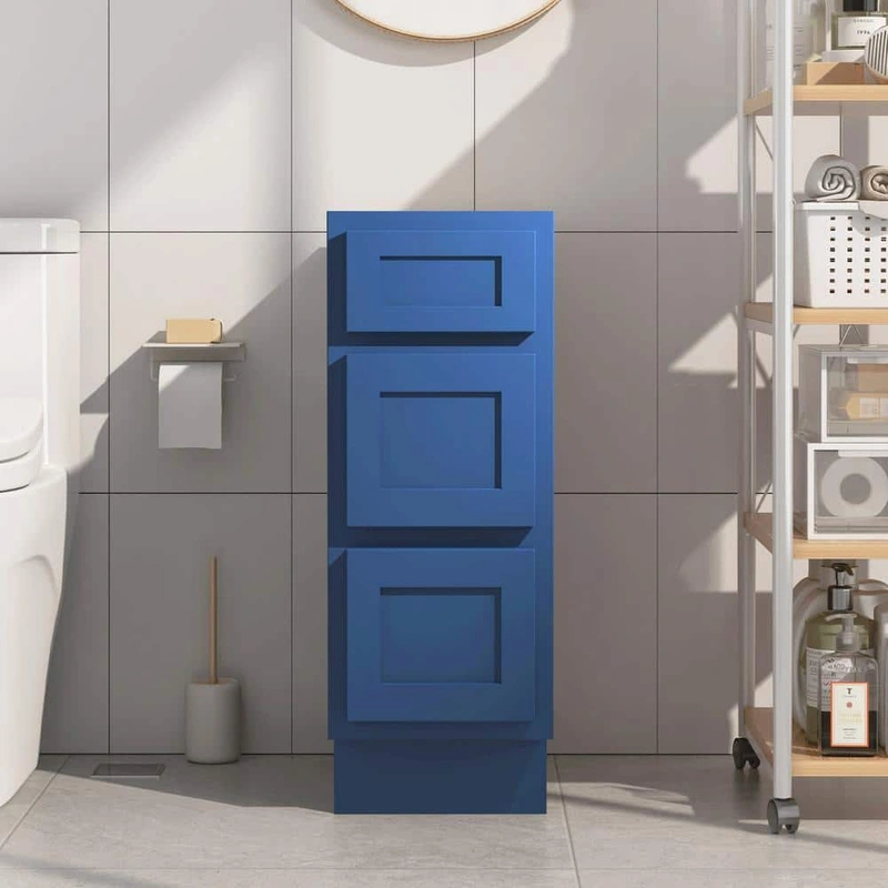Blue 3-Drawer Bath Vanity Cabinet The Vanity Art Blue 3-Drawer Bath Vanity Cabinet is testament to elegance and functionality, featuring soft-closing drawers for seamless storage. Made from premium birchwood, this cabinet offers durability in a sleek, floo