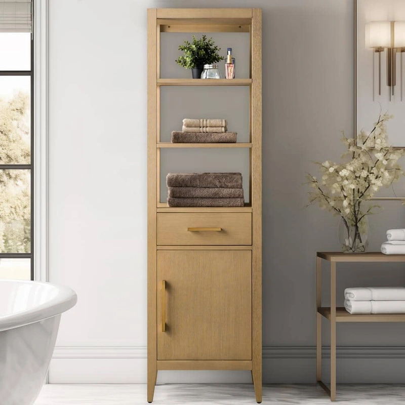 Enhance your bathroom’s functionality with the Vanity Art 72-inch Brown Linen Cabinet, designed with soft close doors in a natural oak finish. Offering spacious storage through adjustable shelves, this freestanding unit is crafted from premium MDF for lasting durability, blending modern elegance with practical design.