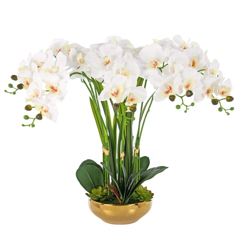 Elevate your space with the luxurious Vanity Art 23.62 in. Artificial Orchid Arrangement, featuring intricate yellow-white blooms in a sophisticated gold-plated ceramic vase. This low-maintenance floral piece adds timeless elegance to any modern or classic home decor.