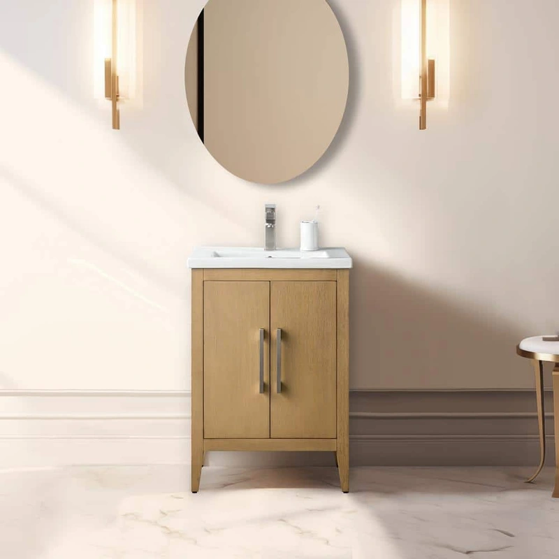Vanity Art 24-inch Single Sink Vanity Elevate your bathroom's elegance with the Vanity Art 24-inch Bathroom Vanity in Natural Oak. This freestanding unit features a durable ceramic countertop and soft-close cabinet doors, combining functionality with timel