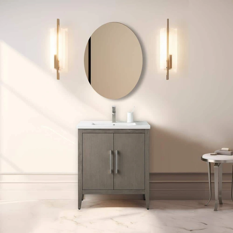 The Vanity Art 30 in. Single Sink Bathroom Vanity blends elegance with practicality, featuring a durable ceramic top and poplar wood cabinet for a stylish, inviting look. Its driftwood gray finish complements any modern decor, while offering ample storage with adjustable shelves to keep your bathroom essentials organized.