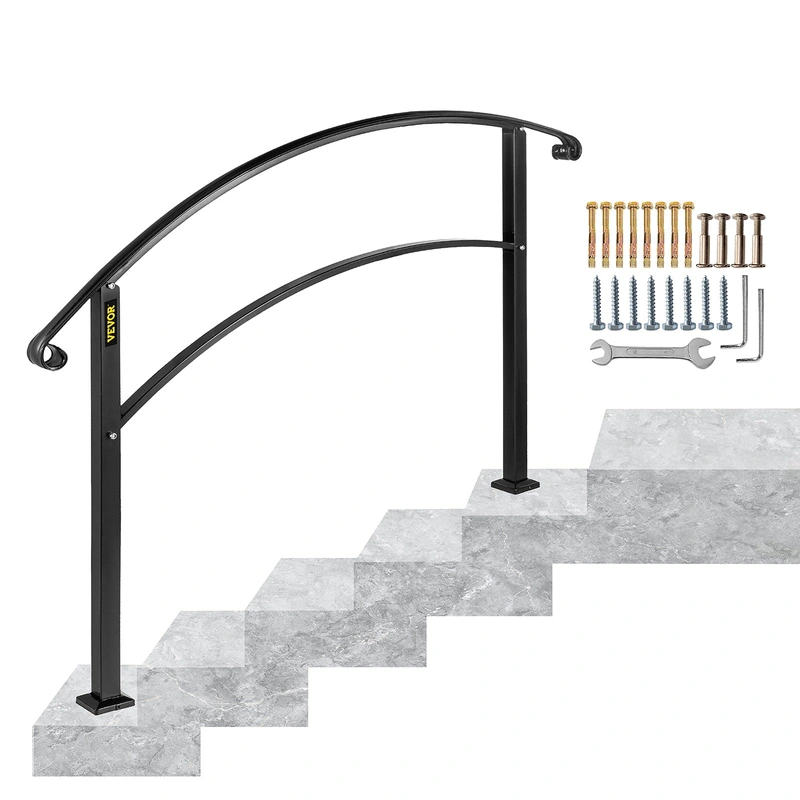 4-ft Black Steel Stair Rail Kit Enhance your staircase's safety and style with the VEVOR 4-ft Black Steel Stair Rail Kit. Constructed from durable wrought iron, this versatile rail is perfect for five steps and features a chic black powder-coated finish th