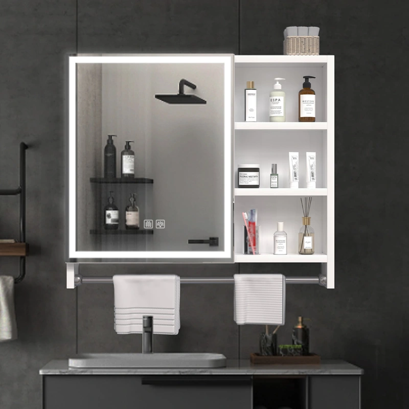 Illuminate your bathroom with the WELLFOR LED Fog Free Medicine Cabinet, a sophisticated solution that combines function and style. This cabinet features a sleek, mirrored door with integrated LED lighting and an anti-fog function, ensuring a clear view even in humid conditions. Perfect for modern living, it offers convenient storage with hidden and external compartments, plus a stainless steel towel rail.