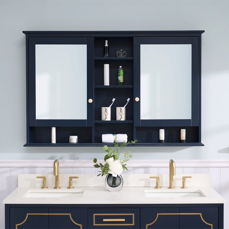 Navy Blue Soft Close Medicine Cabinet The WELLFOR ART Solid Wood Medicine Cabinet offers both style and functionality, featuring a sturdy navy blue poplar wood frame with a sleek mirrored front. This 55-inch by 35-inch surface-mounted cabinet is designed w