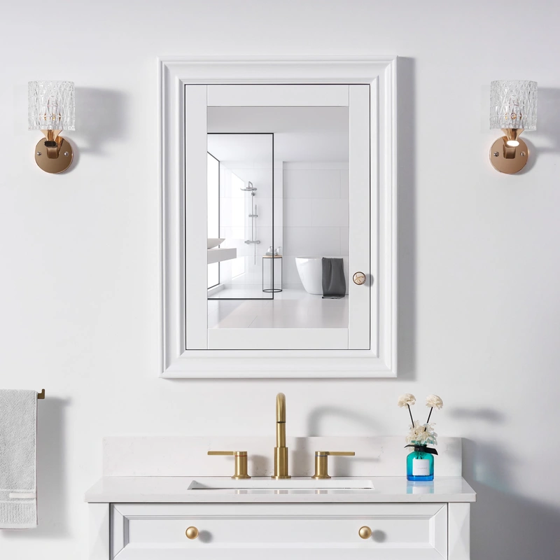 The Grace Solid Wood Mirrored Medicine Cabinet seamlessly merges elegance with functionality, offering a sleek recessed mount design. Featuring Austria BLUM soft-close hinges and a durable poplar wood frame, this cabinet ensures both longevity and quiet operation. Perfect for enhancing organization and style in any bathroom space.