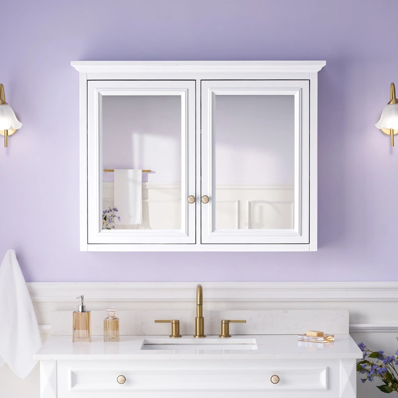 Grace 40" x 30" Solid Wood Mirrored Medicine Cabinet Experience elegance and practicality with the Grace Solid Wood Mirrored Medicine Cabinet. Designed for optimal space utilization, this white framed cabinet features a sophisticated soft-close mechanism a