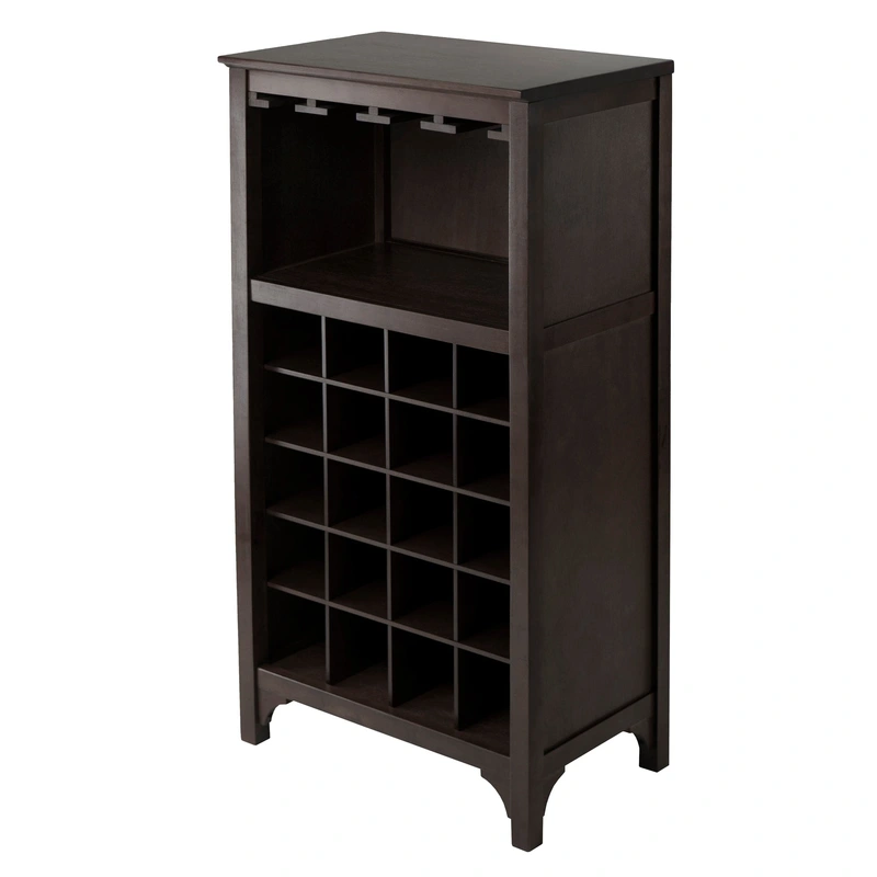 Winsome Wood Espresso Wine Cabinet This Winsome Wood Espresso Wine Cabinet seamlessly integrates style with functionality. Made from solid and composite wood, it offers an elegant solution for wine storage with room for 20 bottles and a dedicated glassware